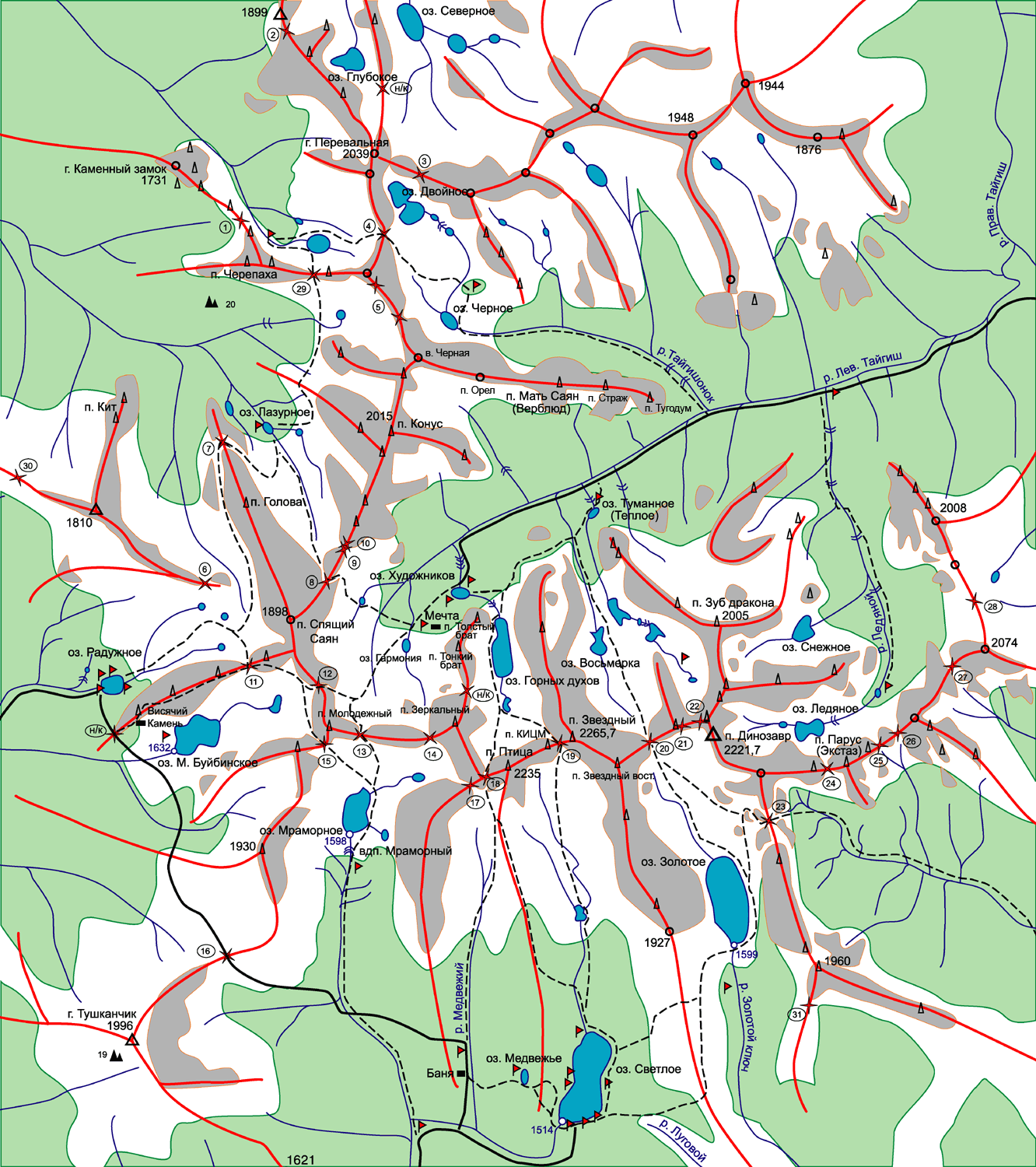 Добираться проще всего до озера Светлое. Тропа идет от дороги (622-й километр трассы Абакан – Кызыл) и начинается от моста через реку Тушканчик. Тропа все время идет справа по ходу вдоль реки Тушканчик, местами сильно заболочена. Тропа однозначная, хорошо натоптанная. Подход занимает примерно 3 часа (около 9 километров и перепад 400 метров). В этом районе планируется проводить женскую часть соревнований.